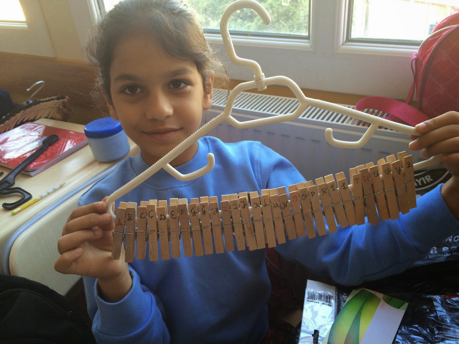 Alfabetik sıralamayı daha iyi öğrenebilmek için mandallara tek tek harfleri yazdık. Harfleri yazarken ince ve kalın seslileri de tekrarladık. Daha sonra mandallarımızı askıya astık.