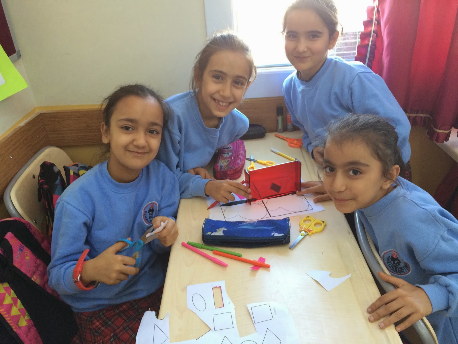 Öğrenciler 5 gruba ayrıldı. Her bir gruba, kelebek ve geometrik şekillerin olduğu kağıtlar dağıtıldı. İlk önce kelebeğin bir kanadındaki şekiller boyandı. Daha sonra diğer kağıttaki şekiller boyanarak, kelebeğin diğer kanadına simetrik olarak yapıştırıldı.
