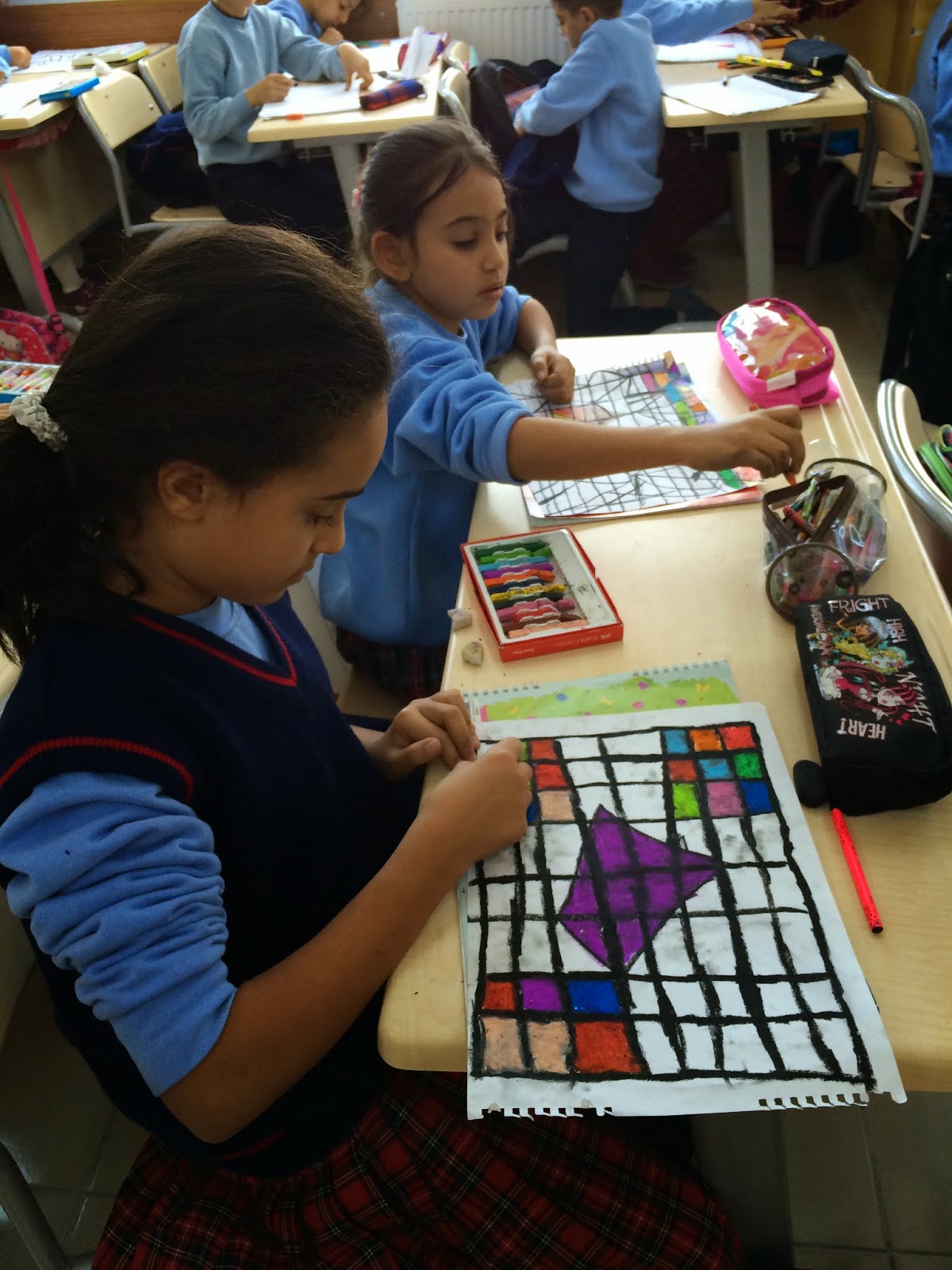 Mondrian'ın geometrik tarzdaki eserlerini inceledik. Daha sonra kendi resimlerimizi yapmaya başladık. :)