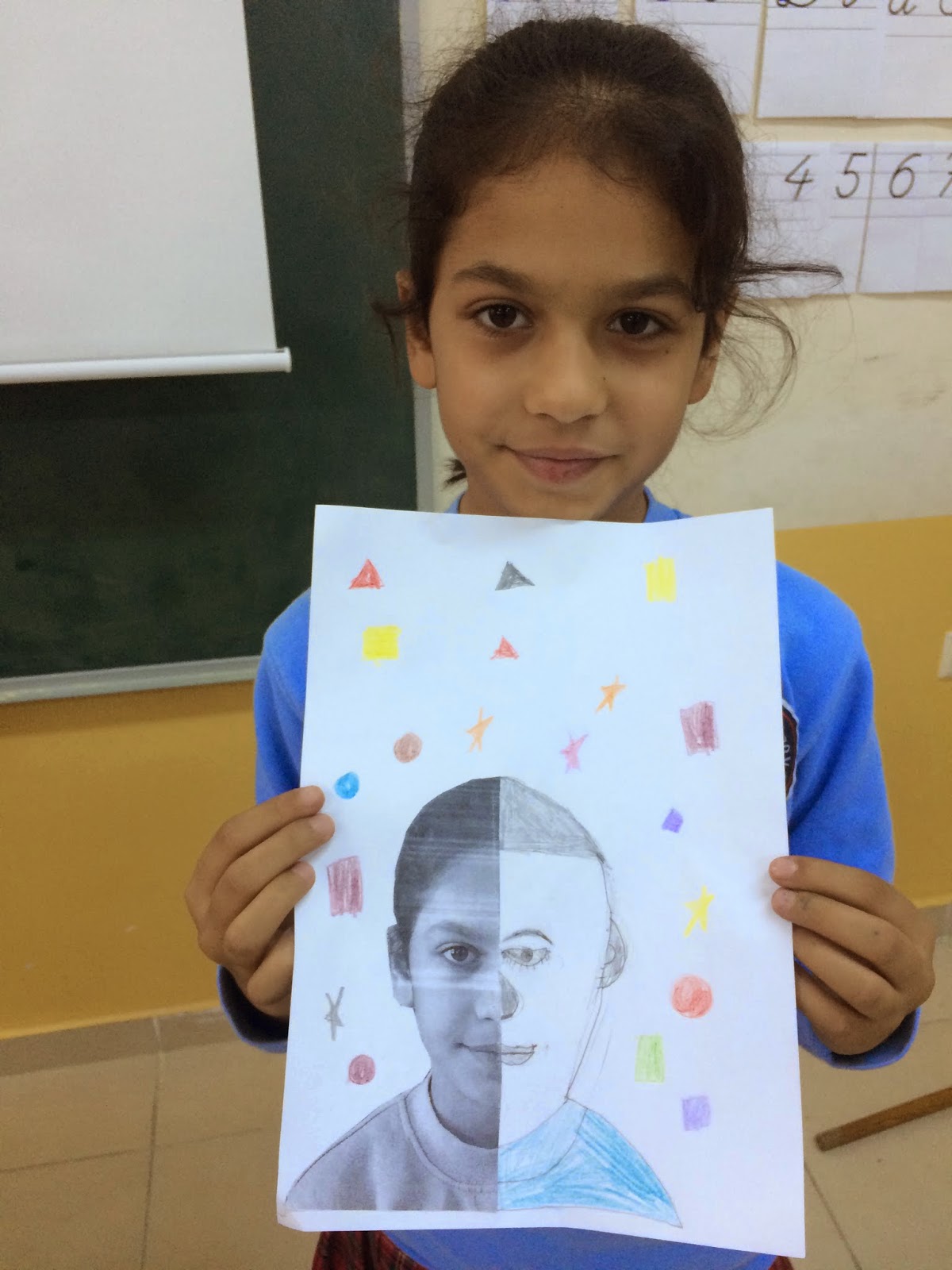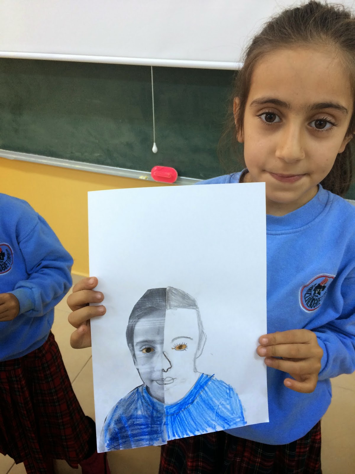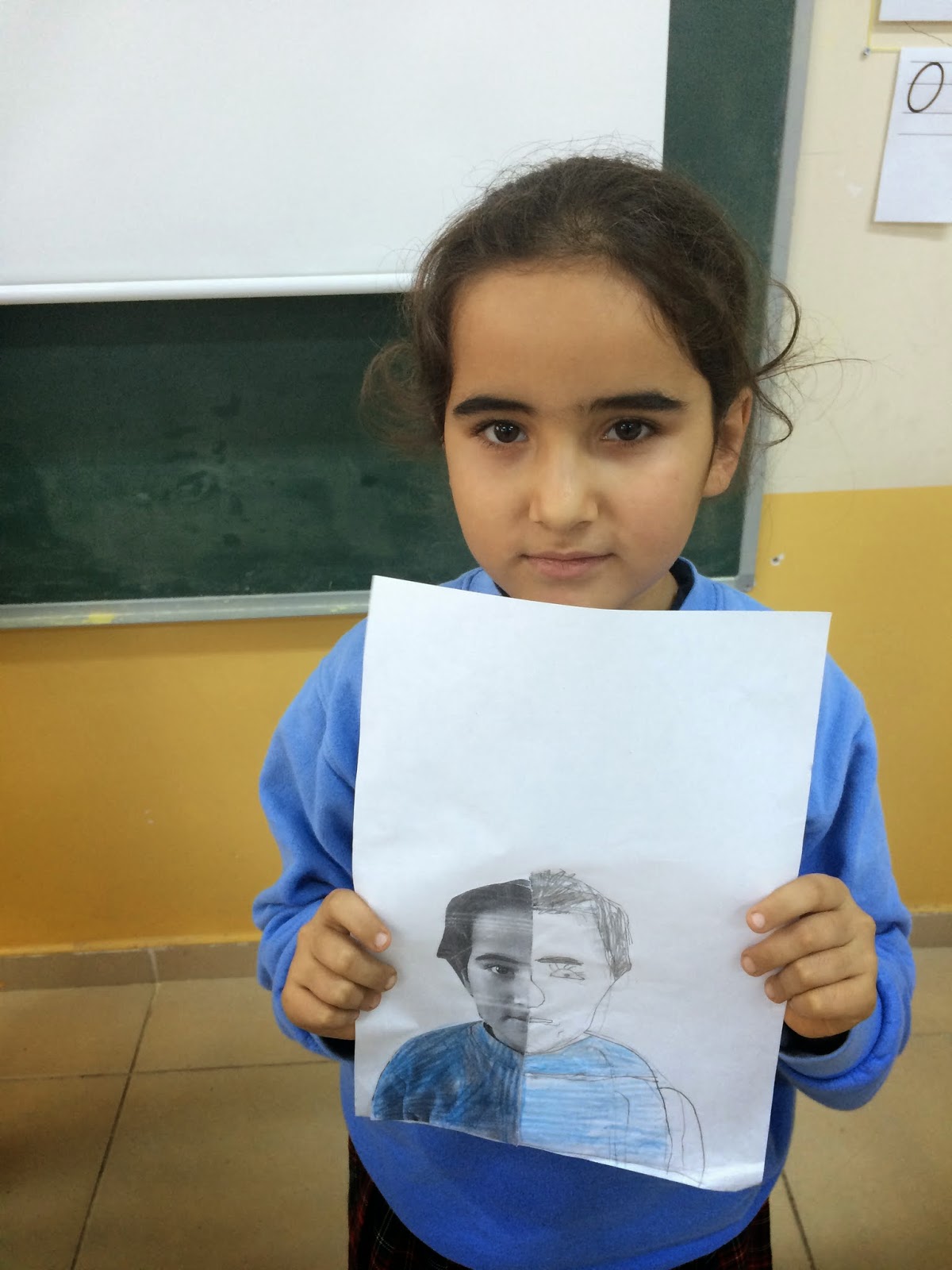 Fotoğraflarını tam ortadan ikiye kestiler. A4 kağıdına yapıştırdılar ve yüzlerinin simetrilerini çizdiler.